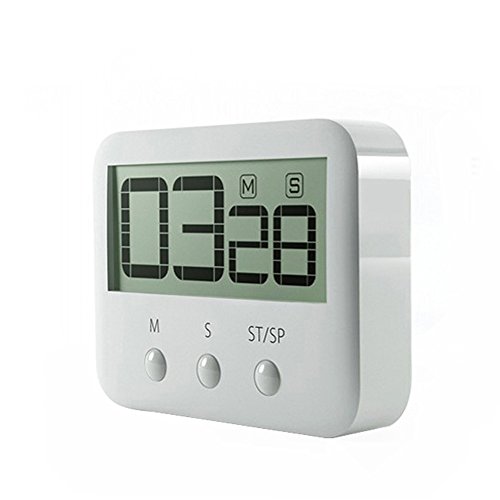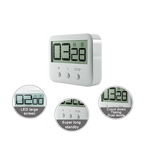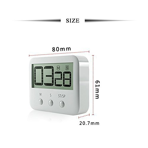 -. Feature : Large, clear digits - Just a glance from across the room and you can easily read the timer display with it's big, bold digits. Ideal for those with not the best eyesight / Counts up and down - As well as a countdown timer and minute timer this can also act as a stopwatch counting up from zero. Perfect timer for homework, exercise, gym workout, cooking (ie egg timer), sports, games and classroom timer activities. Maximum time is 99 minutes, 59 seconds / Loud sounding alarm - You will easily be able to hear this alarm in another room. It is loud and clear but not deafening. The mildly hard of hearing should have no problem with the alarm / Magnetic back, retractable stand and hook for hanging - You have 3 different choices for placement of the Kitchen Timer. Either stick it to the fridge door with its large magnet, or use the pull out stand for table-top use, and finally you can run a piece of string through the hook and hang it on a wall hook or around your neck if you are on the go / ON/OFF SWITCH - SurP.R.Isingly a lot of timers do not have an on/off switch due to the minimal power consumption. But many people prefer electical items to be powered down after use, and with the small, subtle on/off switch on the side you can do just that