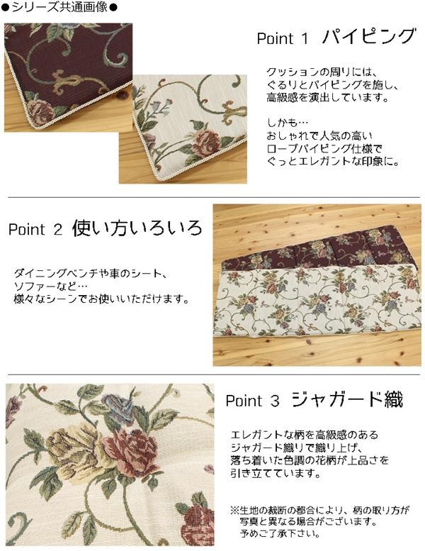 fk094igrjs花柄が上品なクッションです表地にはジャガード織の生地を使用しているため繊細な柄と上品な風合いが特徴です サイズ 個装サイズ:50×10×50cm 重量 個装重量:650g 素材・材質 表地:ポリエステル100% 中材:ポリエステル100%(固綿) 仕様 手洗い可(洗濯機使用不可) 生産国 日本(側地:中国、最終加工:日本) ジャガード織で上品な風合い 花柄が上品なクッションです表地にはジャガード織の生地を使用しているため繊細な柄と上品な風合いが特徴です