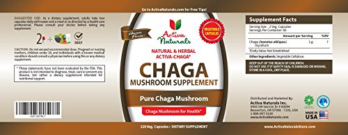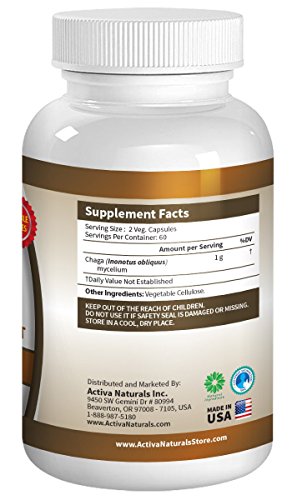 -. Feature : WHY CHAGA MUSHROOMS SUPPLEMENT - Chaga is known as immune-boosting super food due to complex polysaccharides such as Beta-D-Glucans, phytosterols, Betulin and betulinic which may enhance body's immune defense system and may also help provide nutritional support against free radical damage* / MORE VALUE FOR LESS - 120 Vegetarian Capsules, Manufactured in USA, No Fillers, No Chemicals, No Additives, No Artificial Colors and Strict Quality Systems to Give you the best Natural and Herbal Chaga Mushroom Nutritional Supplement / A TRUSTED BRAND - Activa Naturals is Known for their Natural and Herbal Specialty Vitamins providing you the highest quality ingredients - Our Focus is Giving you the Best Chaga Mushroom Capsules rather than Making Any Claims about our products - Trusted and Loved by a Large Number of Loyal Customers / ADOPT HEALTHY LIFESTYLE CHOICES - Improve Quality of Life by Adding healthy foods, daily exercises and the daily required water intake along with Chaga mushroom for a healthy living / BUY CONFIDENTLY FROM US - We will work with you until you are fully satisfied as Activa Naturals Products are always covered by a 60-Day Hassle Free Warranty