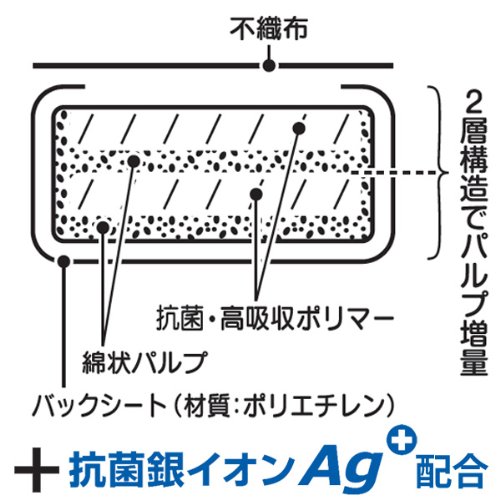 素材構成:表面材:ポリオレフィン系不織布、吸収材:吸水紙、高分子吸収体、綿状パルプ、防水材:ポリエチレンフィルム、接着剤:ホットメルト粘着剤、外装材:ポリエチレンフィルム