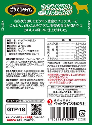 原材料:鶏ささみ、にんじん、ブロッコリー、だいこん、タピオカでん粉、塩化ナトリウム、増粘安定剤(グアーガム、カラギーナン)