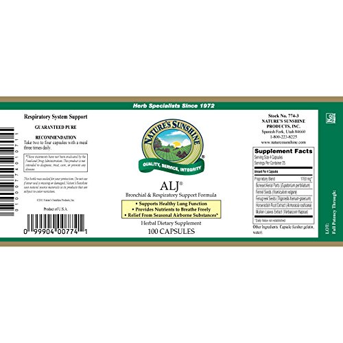 -. Binding : Health and Beauty -. Brand : Nature's Sunshine -. EAN : 0099904007741 -. Feature : Two 100 count capsule containers of Nature's Sunshine ALJ Bronchial and Respiratory Support Formula / Anti-Allergenic Fast Acting relief from Seasonal Airborne Substances / Supports Healthy Lung Function / Provides nutrients to breathe freely / Decongestant - Expectorant - Anti-Catarrhal -. IsAdultProduct : 0 -. Label : NATURE'S SUNSHINE -. LegalDisclaimer : These statements have not been evaluated by the Food and Drug Administration. This product is not intended to diagnose, treat, cure, or prevent disease. -. Manufacturer : NATURE'S SUNSHINE -. PackageQuantity : 200 -. ProductGroup : Health and Beauty -. ProductTypeName : HEALTH_PERSONAL_CARE -. Publisher : NATURE'S SUNSHINE -. Studio : NATURE'S SUNSHINE -. Title : Nature's Sunshine ALJ Bronchial and Respiratory (Pack of 2) -. UPC : 099904007741