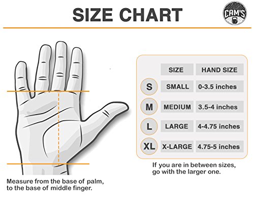 -. Feature : %100 PROTECTION FROM BLISTERS, TEARS & HAND DISCOMFORT- Cam's are made with the absolute softest and most comfortable leather on the market. So soft and comfortable in fact, that it doesn't even feel like you have anything on your hands when wearing Cam's. Wether your doing pull-ups, deadlifts, benchpress, squats or any other movement, your palms will be comfortably protected from blisters and tears, so that you can focus on your workout and not your ripped up hands. / HIGH QUALITY DOUBLE LAYERED LEATHER- Two layers of cowhide leather stitched together, that fit and mold to your hand, acting as a comfortable protection. Due to the high quality leather used, the gloves are not made to be overly thick, therefore still allowing your hands to really mold to and feel the bar and provide that extra grip that can be very helpful towards the end of a workout when your forearms are shot. / SUPERIOR WRIST SUPPORT- Cam's are designed with two separate velcro mechanisms built into the wrist straps, keeping the straps from moving or coming undone, so that you do not have to fidget with or adjust them through your workout. Cam's are designed to be double wrapped around the wrist with room for you to tighten them to your comfort level. Wearing a pair of Cam's will give you the full benefit of having great wrist straps, along with a superior glove, built into one. / NO MORE STINKY HANDS- Do you lift weights with the back of your hands? NO! So why does there need to be excess material on the back of your palms causing your hands to sweat and stink like an old pair of sneakers? There doesn't. Cam's got rid of that unnecessary material and now allow your hands to breath in comfort rather than get hot, sweaty and stinky. Plus they just look better this way, honestly. / NO QUESTIONS ASKED, MONEY BACK GUARANTEE- If you put on your Cam's, wear them for a few sessions at the gym, and they happen to not be for you, we would be more than happy to give you your money back and you can keep the gloves. No hard feelings.