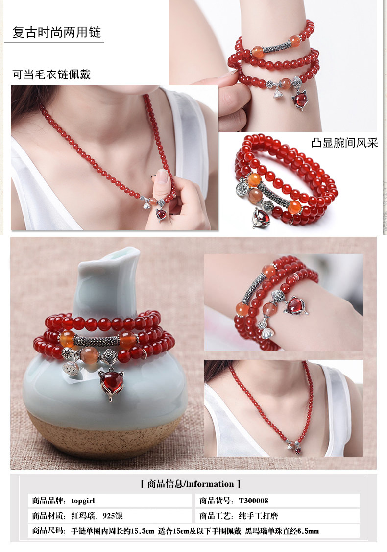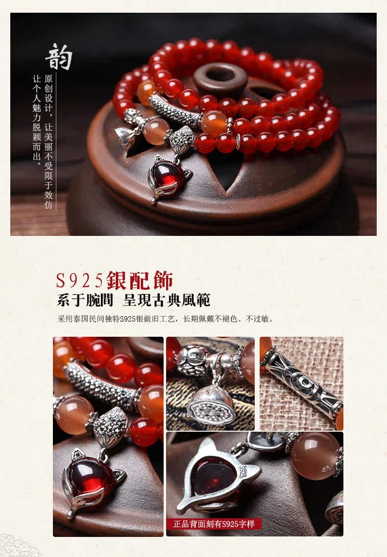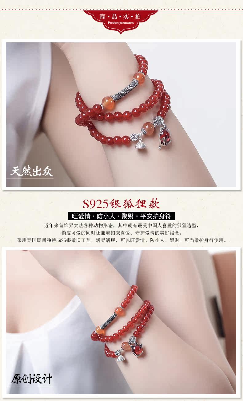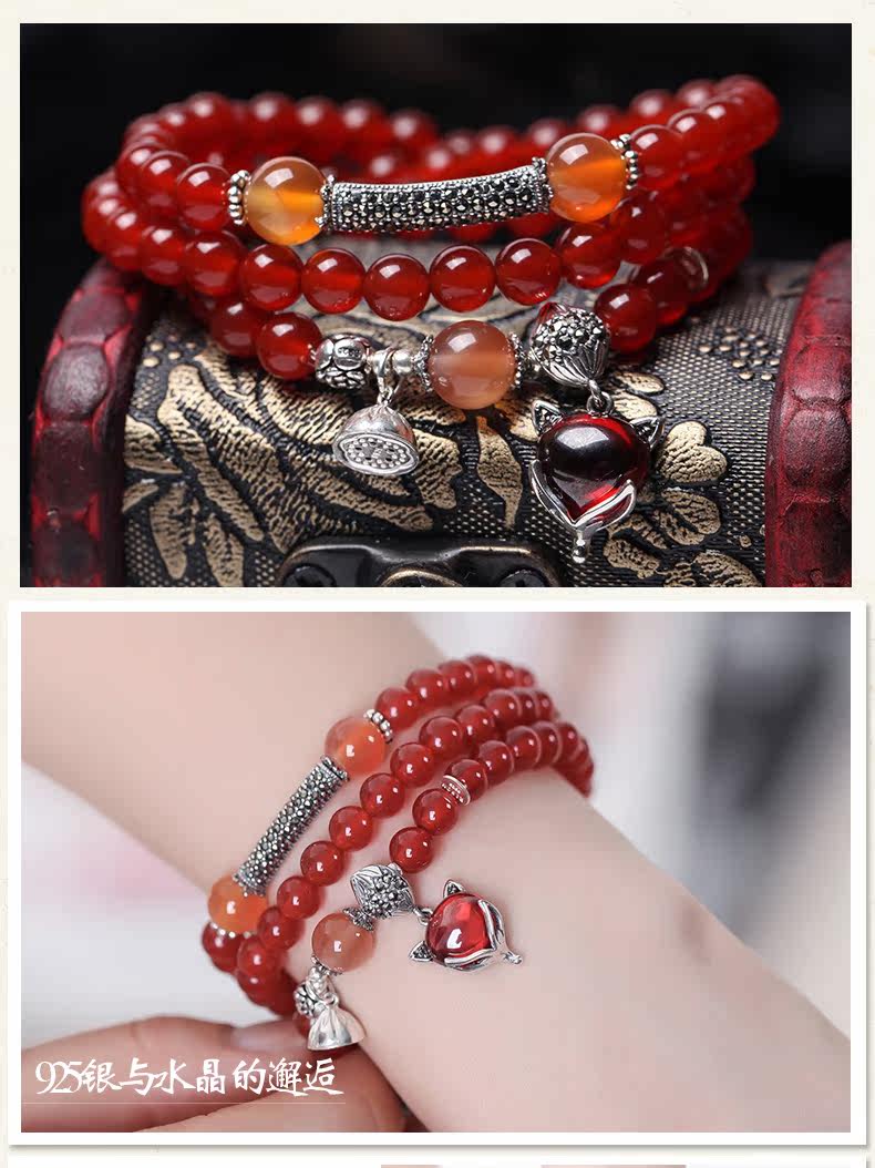 天然红玛瑙水晶手链女925银狐狸微镶 气质百搭饰品手串