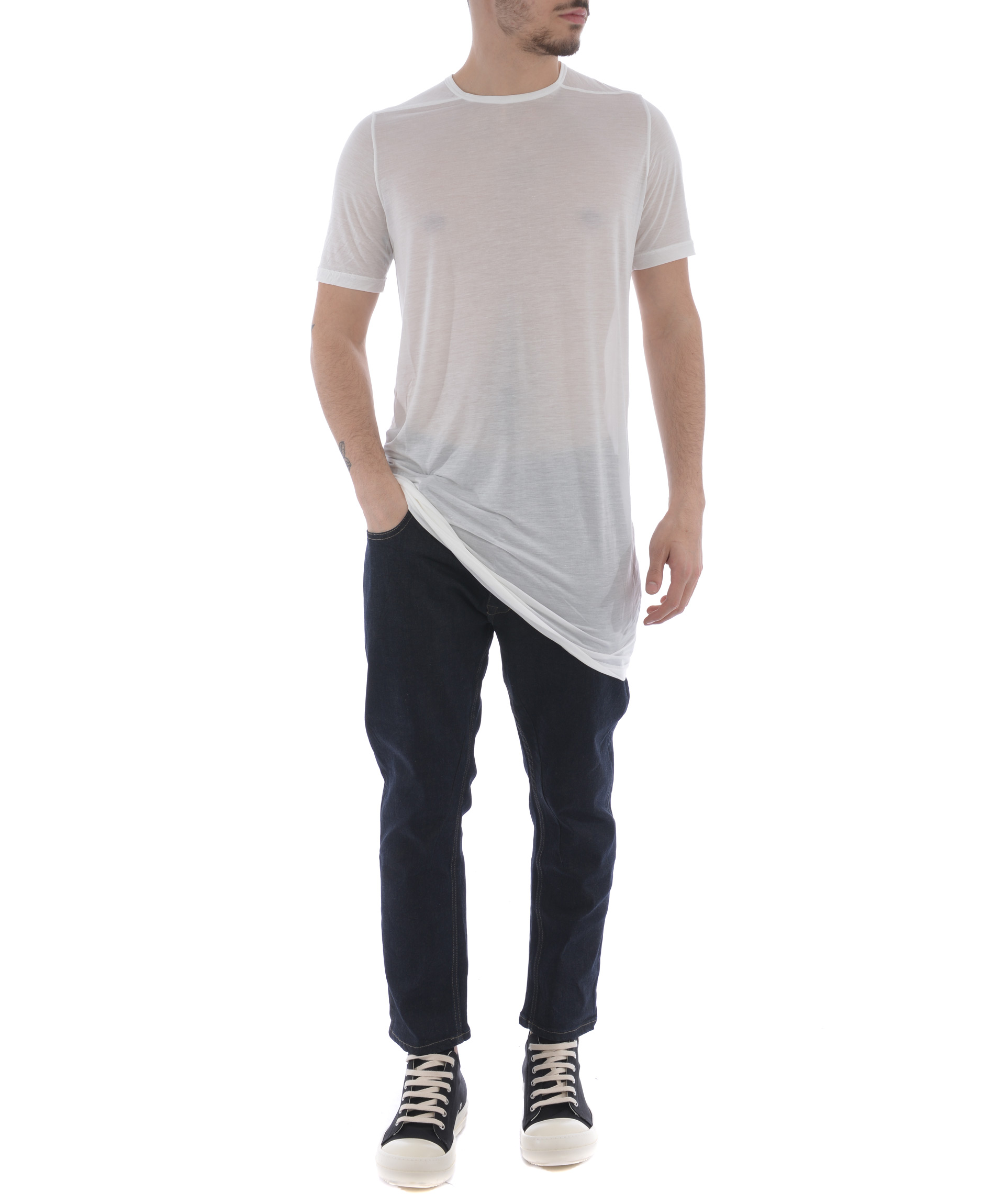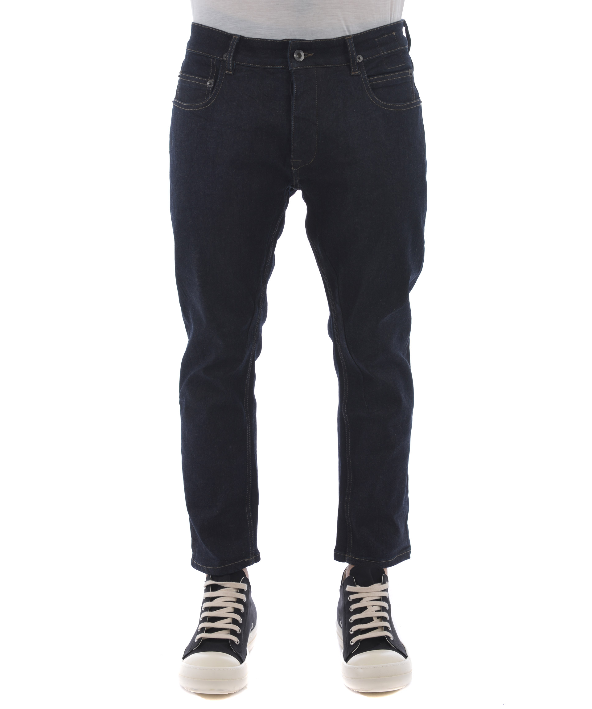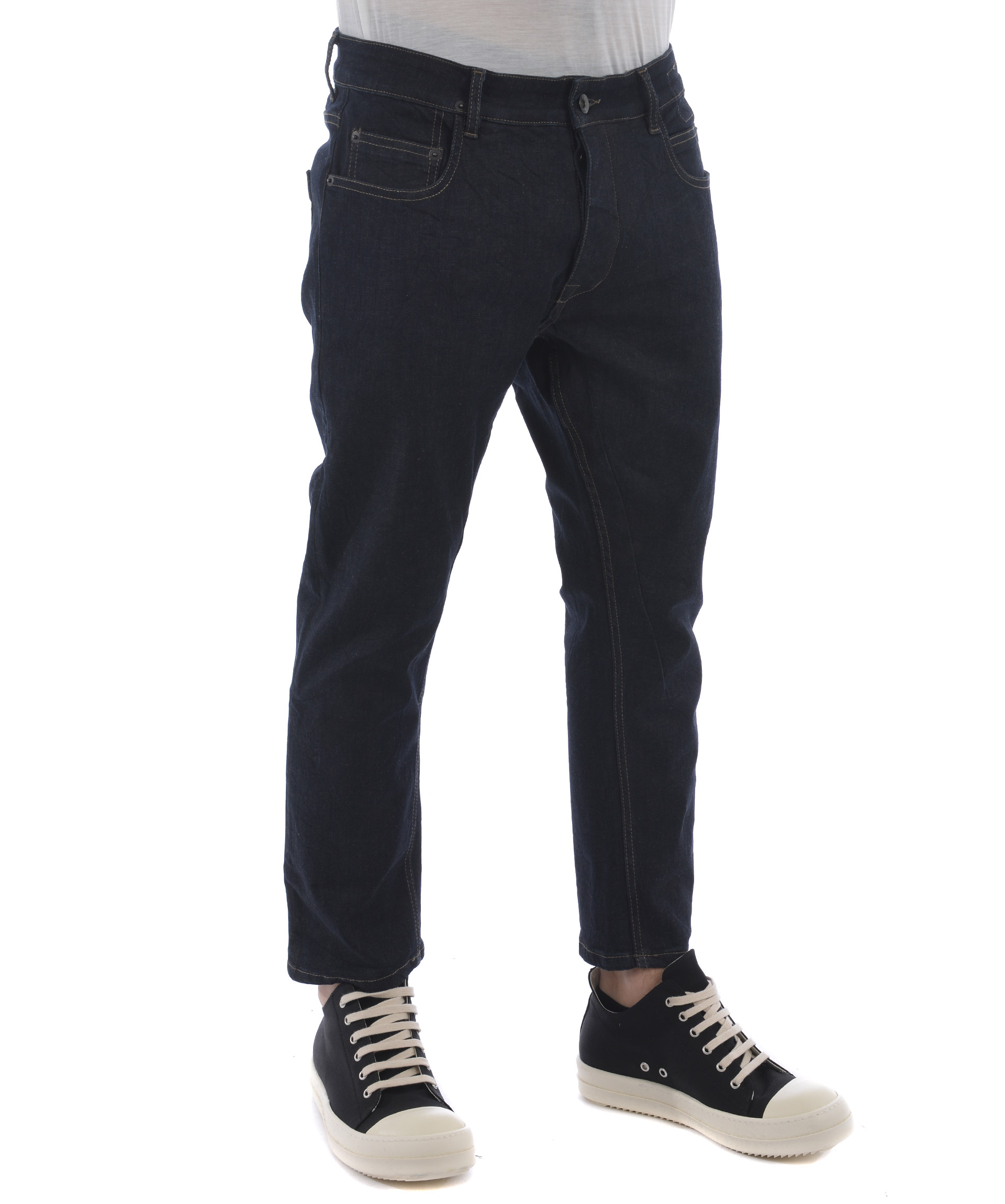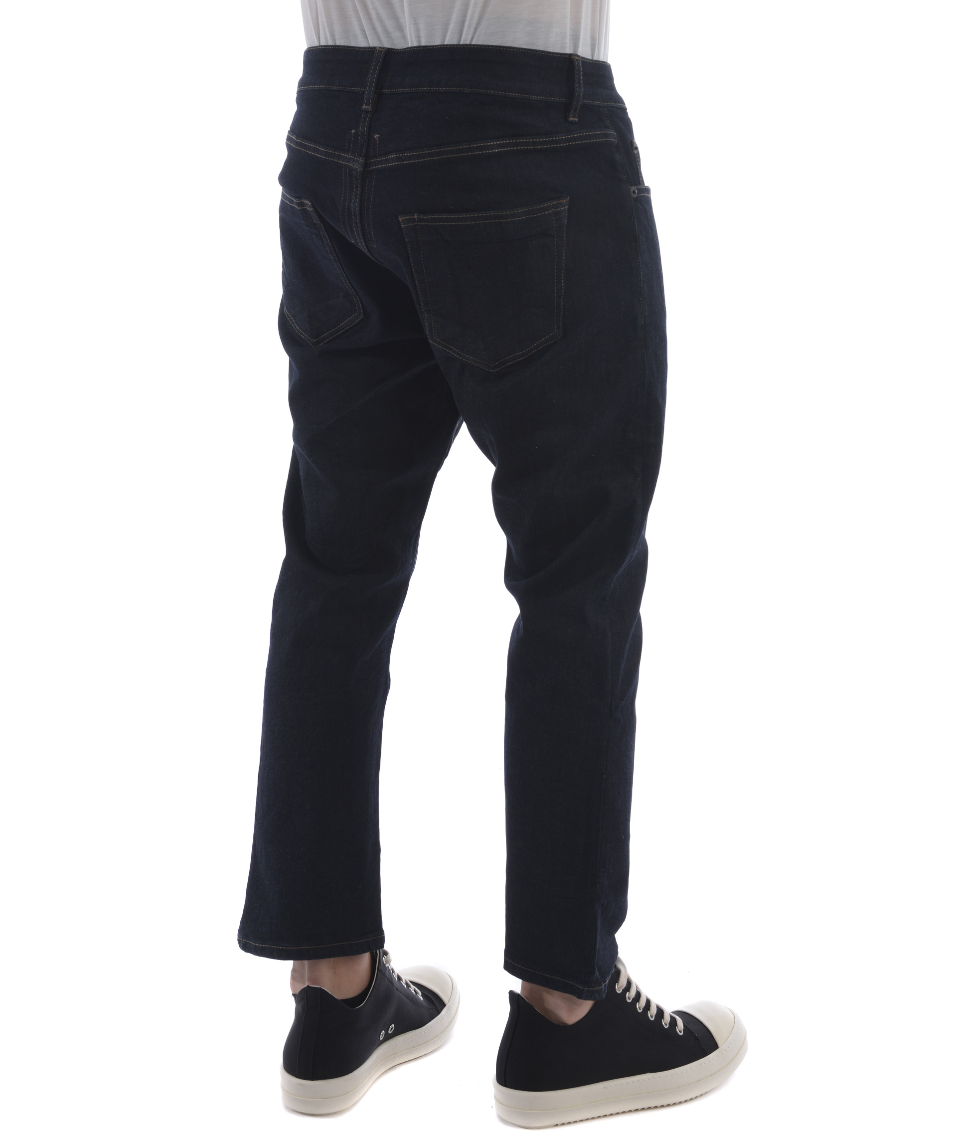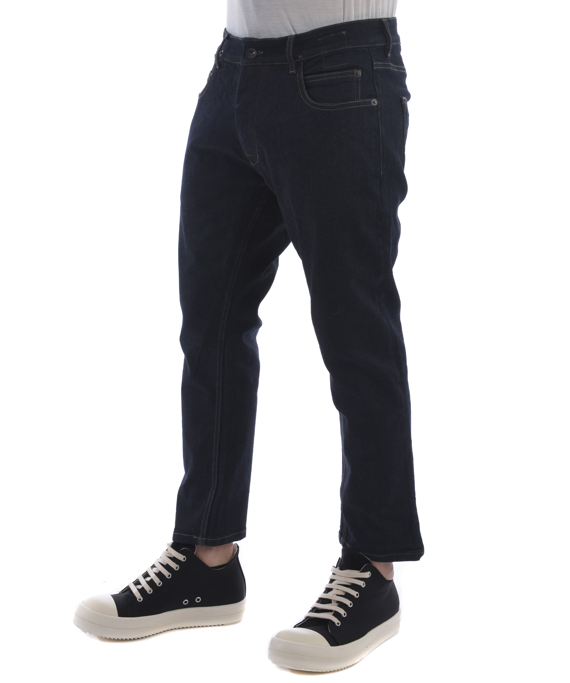 Jeans Rick Owens DRKSHDW in denim stretch Blu scuro. 5 tasche. Chiusura con bottoni. Modello alla caviglia. Misura in foto 32 91% cotone, 6% polibutilentereftalato, 3% elastene