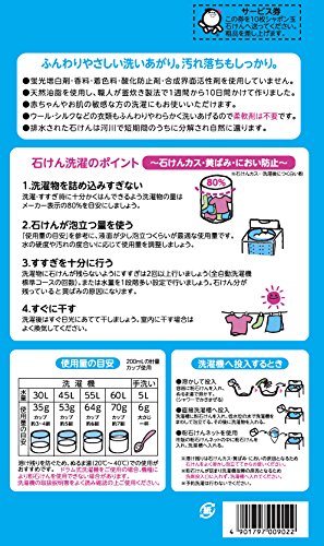 良質の天然油脂を100%使用した、純石鹸分99%の洗濯用粉石鹸。様々なタイプの繊維の汚れを、すぐれた洗浄力できれいに落します。 原産国 : 日本 内容量 : 2.1kg 商品サイズ (幅X奥行X高さ) : 180mm×110mm×340mm