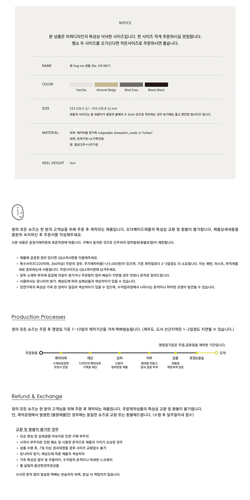 - 주문시 유의사항 : -흰의 모든 슈즈는 한 분을 위해 주문 후 제작하는 오더메이드슈즈입니다. -결제가 완료되면 익일 오전부터 수제화공장을 통해 제작하게되며, 약 일주일의 제작기간을 거쳐 택배를 통해 받으실 수 있습니다. -주문제작상품의 특성상 제품불량이 아닌 단순변심에 의한 교환 및 환불이 어렵습니다. 컬러와 사이즈를 신중하게 결정하신 후 주문해주세요. - 본 상품은 넉넉한 피팅감의 샌들입니다. 한 사이즈 작게 주문하시길 권장합니다. - 평소 두 사이즈를 오가셨다면 작은사이즈로 주문해주세요.