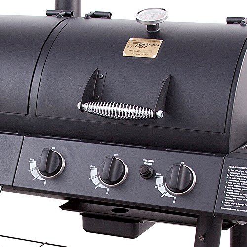 - Feature : 1,060 total square inch cooking surface / 750 square inch primary cooking surface in main chamber over porcelain-coated cast iron grates / 310 square inch cooking surface in firebox chamber / 3x 12,000 BTU Burners, (36,000 BTU's total) in gas grilling chamber / 12,000 BTU side burner accommodates charcoal chimney starter