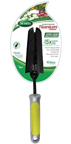 Features Titanium Non-Stick blade and impact resistant AirShoc grip with antimicrobial protection. Trowel/Transplant blade will resist saps and adhesive substances and is 5x harder than untreated steel so it will stay sharper longer. Features saw and knife edges, weeding tip, measurement scale and twine cutter. Lifetime Warranty. Silver/Green handle. Powered by Clauss.Feature