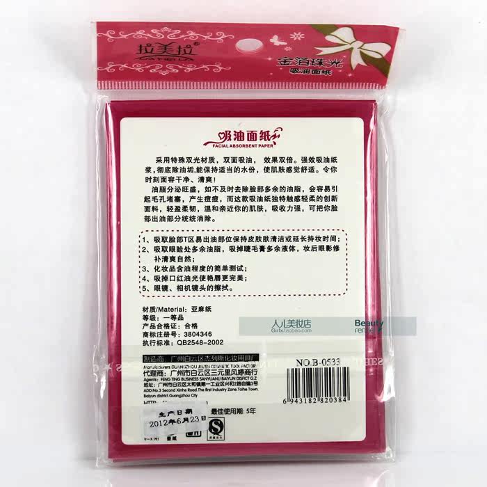A greasy feel when out a film on the skin, light pressure on the skin easy parts out of oil. The paper is soft and silky, gently press, immediately toyour face too much grease thoroughly adsorption; have a good makeupeffect, no longer afraid to fly to suck