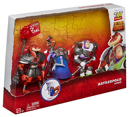 What happens when the main Toy Story gang encounters a group of fierce dinosaurs who do not yet know they are toys? With this Battleopolis 3-pack, kids can decide how it all unfolds! Based on the Toy Story TV special Toy Story That Time Forgot, this fearsome trio features Battle Armor Buzz Lightyear, Reptillus Maximus and the Cleric, who is a character exclusive to this 3-pack! Each figure looks ferocious with their protective black armor and unique weaponry. Equipped with rolling wheels, the Cleric can easily glide into action—it’s time to battle! Kids will want to re-enact their favorite scenes from the toon or imagine all new ones! Includes 3 Toy Story figures and 3 accessory pieces. Colors and decorations may vary.Feature