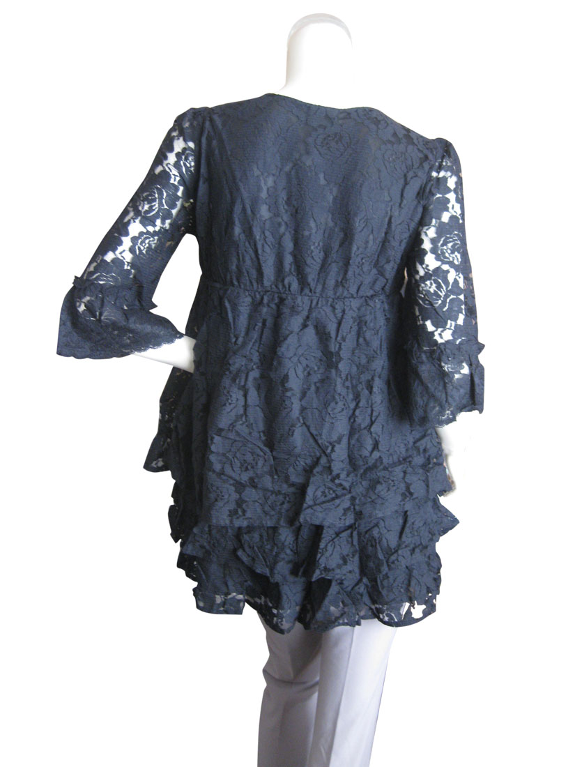 透け感のお洒落なフリル7分袖に裾ティアード、胸元切り替え、
