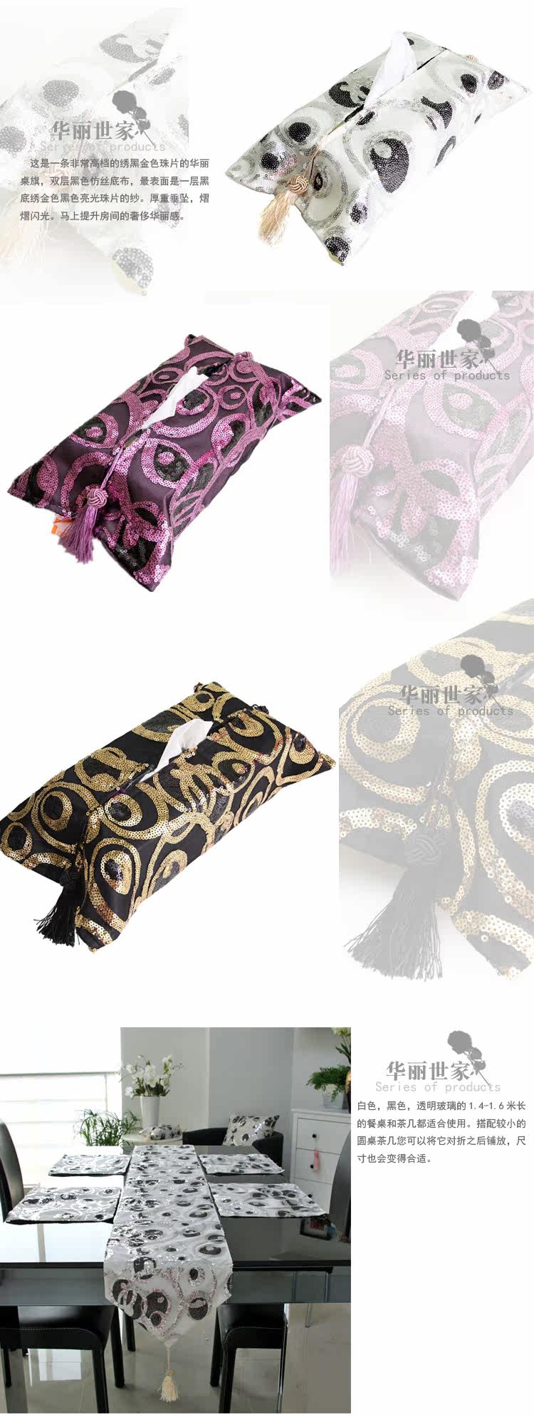 Change the home of fabric products, color can achieve the fastest, most economical family decoration effect. The curtain, cushion, sofa cushion, tablecloth, details the pursuit of you, tissue box even little also not let go oh!! The tissue box is made of double-layer purple silk cloth, the surface is a layer of Black Embroidered purple black light beads yarn.Heavy pendant, shining. Immediately lift the room feeling ofluxury.