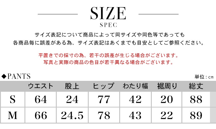 | サイズ | ウエスト:[S]64cm [M]66cm 股上:[S]24cm [M]24.5cm ヒップ:[S]77cm [M]78cm わたり幅:[S]42cm [M]43cm 裾周り:[S]20cm [M]22cm 総丈:[S]88cm [M]89cm |