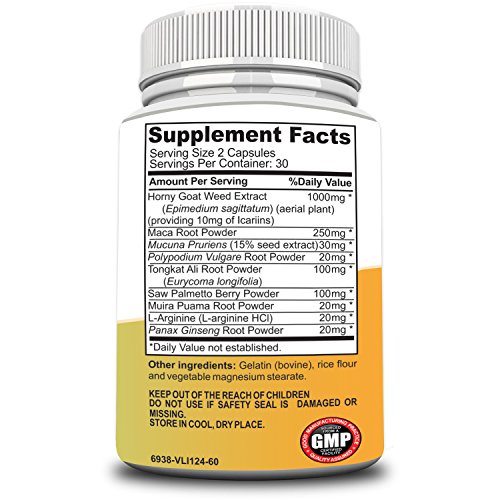 - Feature : SUPPORTS LIBIDO & ENHANCES PERFORMANCE - Our advance blend of health supplements helps increase performance and sexual desire. A pure and natural mix of amazing formula for stamina and extra energy. Great supplement for Men or Women / AIDS IN MENTAL ALERTNESS - Helps to support mental awareness while giving that extra energy for focus and readiness. This helps to maintain increased energy and reduce fatigue / SUPPORTS IMMUNE SYSTEM - Known to improve immune system without the usual side effects / MAXIMUM POTENCY & IDEAL DOSAGE - Contains high strength and dosage to provide maximum effectiveness. Each capsule contains 1000 mg of Horny Goat Weed Extract along with 250 mg of Maca Root Powder. No preservatives or artificial flavors added. This bottle contains 60 capsules (or 1 months supply) / BEST QUALITY - These pills are made in USA in an FDA inspected and GMP certified facility to ensure quality. Made from all natural vitamins, minerals and herbs. Contents from 100% plant extracts. Order 2 or more to get free shipping and get 2 months' supply at the same time