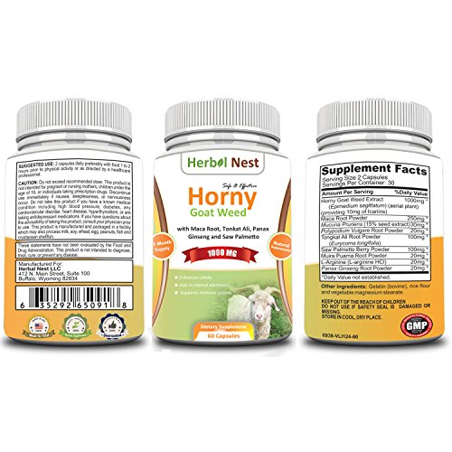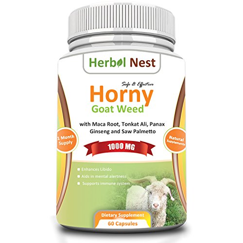 - Title : Horny Goat Weed extract with Maca Root, Tongkat Ali, Panax Ginseng, Saw Palmetto & 6 other ingredients. Supports libido for extra performance and desire. The formula aids in mental alertness all the while supporting immune system. The bottle contains unique blend of clinical strength supplement for men and women with over 1400 mg of natural herbs - 60 tablets (or 1 month supply).