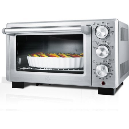 Feature : Turbo convection heat technology cooks food faster and browns more evenly / Independent dial controls for temperature, cook function and timer settings / Convection toaster oven with brushed stainless steel finish | Would make a great housewarming gift / Includes removable crumb tray, removable broil rack and baking tray / Silver toaster oven designed to look great on a kitchen counter
