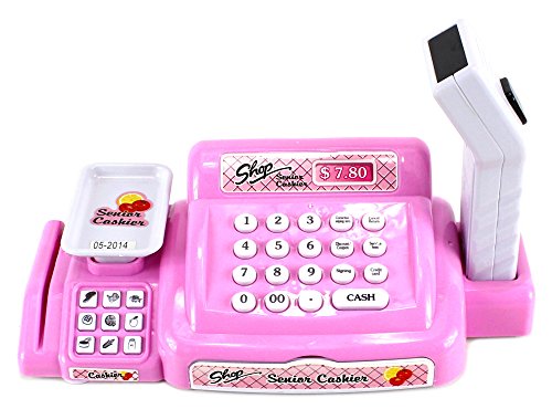 -. Title : Senior Cashier Cash Register Pretend Play Battery Operated Toy Cash Register w/ Lights, Sounds, Scanner, Toy Food, Shopping Basket