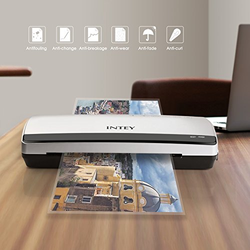 New slim design now warms up 4A faster! Ready in under 5 minutes and laminating speed is 9.84 inches per minute.For items up to 9 inches wide. Compact design is easy to carry and easy to store when laminating products. INTEY Thermal Laminator protects documents you handle frequently. This thermal laminator provides a professional quality finish and protects items from damage. With a 5-6 minute warm up time, quick laminating speed, a compact design, it's great for projects in the home, school and office.