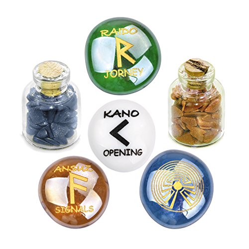 Ancient Runes Journey Raido Kano Ansuz Focus Inspirational Amulets Glass Stones Goldstone Bottles Set