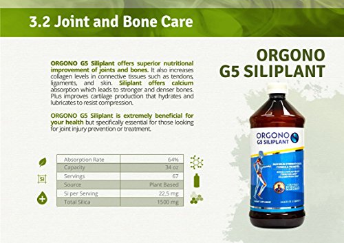 Orgono G5 Siliplant is beneficial for health but essential for anyone with joint problems or bone related issues. Silica is part of phosphorus, magnesium and calcium metabolism. In the ossification proces, silica is linked to calcium, making it essential for calcium absorption and utilization in bone. Silicium Laboratories introduces G5 Siliplant, the highest bioavailable plant based silica product available today. This product was created by the renown silica specialist, Dr. Loic LE Ribault. G5 Siliplant provides the ideal amount and absorption of this essential mineral. This extra strength formula offers superior support and delivers numerous collateral benefits. G5 Siliplant's main component is silicic acid which utilzies silica from horsetail extract as a stabilizer to avoid malabsorption. (The common failing in all current horsetail silicas available commercially) The benefits gained have been show in independent research: Improved calcium absorption leading to stronger and denser bones, increased cartilage production, connective tissue flexibility, increased collagen and elastin production, higher tensile strength hair follicles, stronger finger and toenails, toxic aluminum elimination and improved nerve synapse (signaling) function. At Silicium Laboratories we use research conducted by Dr. Ribault to create a complement to the Orgono Living Silica (G5 in Europe) providing this Extra Strength version. The new G5 Siliplant is fully adapted to the latest European Rules on Food Supplements and possesses a National Code of Pharmacy reference.All our products are FDA inspected as well. G5 Siliplant combines the benefits of silicic acid and horsetail extract, a plant with high crystallized silicon content, which provides the organic compound. With these ingredients and applying the methods of Dr. Loic Le Ribault,we have achieved an organic soluble silica which is highly bioavailable demonstrating the same qualities of its famous sister product.Feature