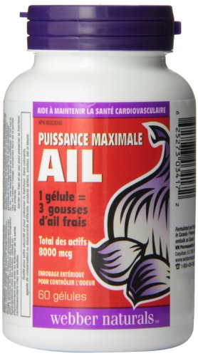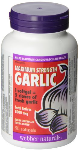 -. Binding : Health and Beauty -. Brand : Webber Naturals -. EAN : 0625273034172 -. Feature : 1 softgel = 3 cloves of fresh Garlic, containing 4215mcg of Allicin / Garlic may be one of our most potent disease-fighting herbs / Helping to prevent cardiovascular disease, high blood pressure / Good for cardiovascular health / Garlic is also recognized for its role in boosting immune function. -. IsAdultProduct : 0 -. Label : Webber Naturals -. Manufacturer : Webber Naturals -. PackageQuantity : 1 -. ProductGroup : Health and Beauty -. ProductTypeName : HEALTH_PERSONAL_CARE -. Publisher : Webber Naturals -. Studio : Webber Naturals -. Title : Webber Naturals MediGar™ Maximum Strength Garlic, 4215mcg Allicin, 60 softgels -. UPC : 625273034172