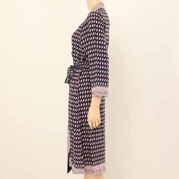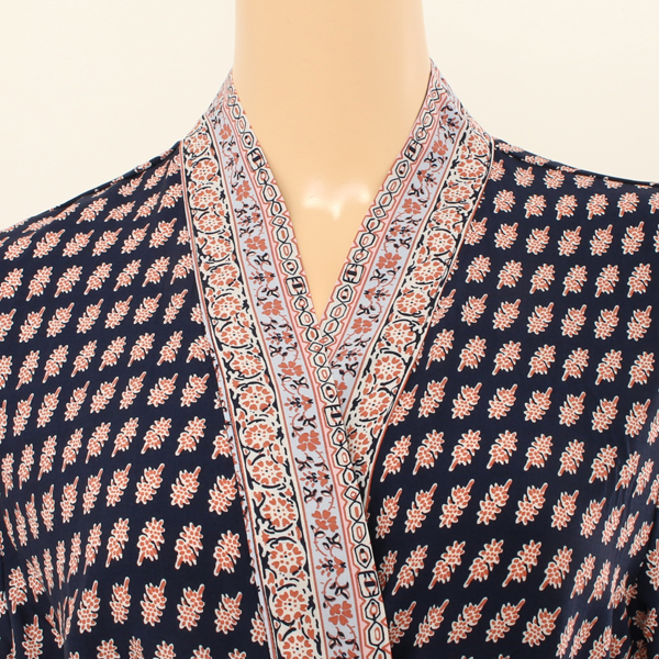 기하학 보더 프린트가 에스닉하면서 트렌디하며 앞단, 소매단 소매단, 밑단에 포인트로 보더가 있는 로브가운입니다
