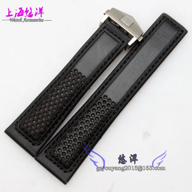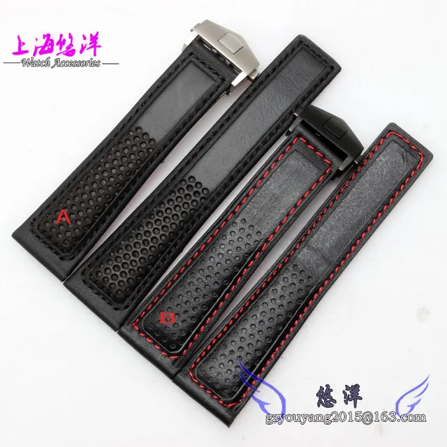 | [해외]22 미리메터 새로운 남성 고품질의 스테인레스 스틸 나비 걸쇠 버클 레드 스티치 블랙 정품 가죽 시계 밴드 스트랩 |