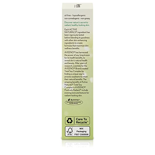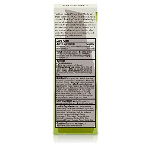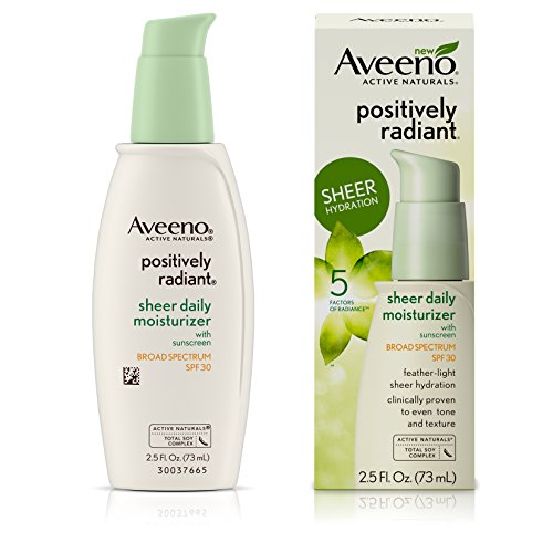 -. Binding : Health and Beauty -. Brand : Aveeno -. EAN : 0381371172849 -. Feature : 2.5-fluid ounce bottle of sheer oil-free daily facial moisturizer to transform dry skin into naturally radiant skin / Hypoallergenic and non-comedogenic lotion provides enough hydration for winter use while being non-greasy enough to use in the summer / Contains Active Naturals Total Soy Complex which is clinically proven to help improve skin's tone and texture in just 4 weeks. / Deeply hydrates skin for a long-lasting 24 hours while lightweight enough to allow skin to breathe / Provides broad spectrum SPF 30 UVA and UVB protection against the sun -. Label : Johnson & Johnson Consumer Inc. -. Manufacturer : Johnson & Johnson Consumer Inc. -. MPN : 117284 -. NumberOfItems : 1 -. PackageQuantity : 1 -. PartNumber : 117284 -. ProductGroup : Beauty -. ProductTypeName : BEAUTY -. Publisher : Johnson & Johnson Consumer Inc. -. ReleaseDate : 2017-09-10 -. Size : 2.5 Ounce -. Studio : Johnson & Johnson Consumer Inc. -. Title : Aveeno Positively Radiant Sheer Daily Moisturizing Lotion for Dry Skin with SPF 30, 2.5 fl. oz -. UPC : 381371172849