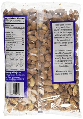 -. Binding : Misc. -. Brand : Trader Joe's -. EAN : 0799600852439 -. Feature : Weight 16 Oz (454 Grams) / Everyday Seasoning With Grinder / Nonpareil variety means "no equal" / Most expensive variety due to their consistelntly high quality / Good source of dietary fiber -. IsAdultProduct : 0 -. Label : Trader Joe's -. LegalDisclaimer : Actual product packaging and materials may contain more and different information than what is shown on our website. We recommend that you do not rely solely on the information presented and that you always read labels, warnings, and directions before using or consuming a product. Please see our full disclaimer below. -. Manufacturer : Trader Joe's -. PackageQuantity : 1 -. ProductGroup : Grocery -. ProductTypeName : GROCERY -. Publisher : Trader Joe's -. Size : 16 ounces -. Studio : Trader Joe's -. Title : Trader Joe's Dry Roasted & Salted Almonds -. UPC : 799600852439