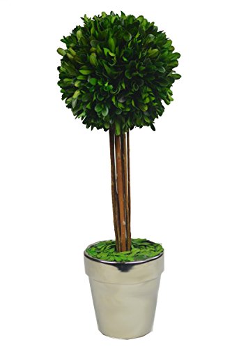 - Boxwood Ball topiary plant with natural twig stem in decorative container featuring shiny metallic silver finish; measures approximately 18-inches tall