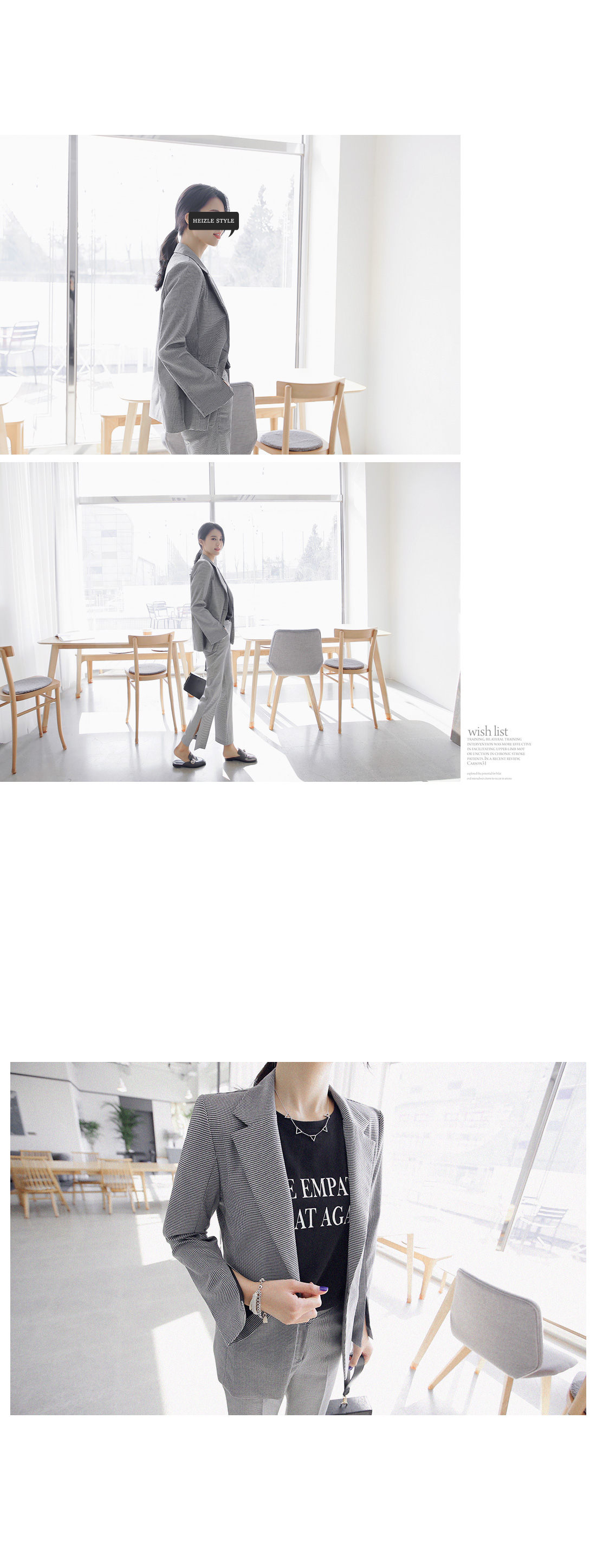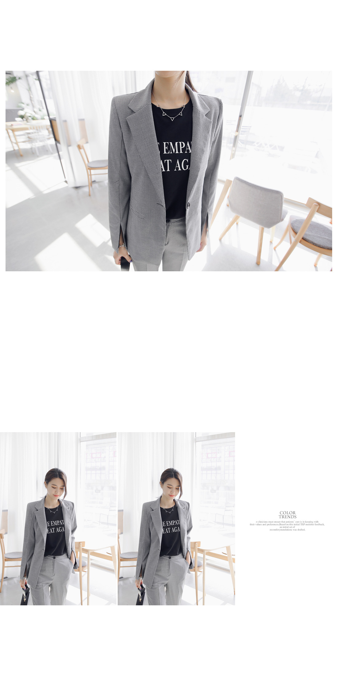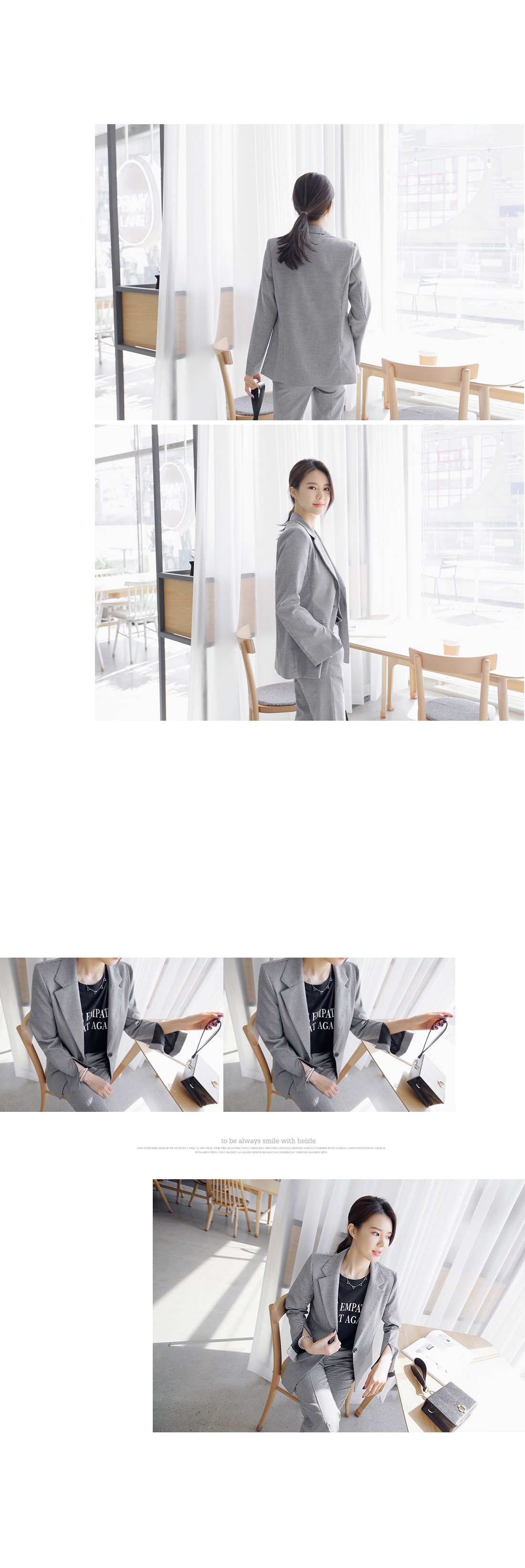 군더더기없이 깔끔한 핏감의 자켓 아이템이예요~^^ 체크패턴과 소매트임으로 모던하고 스타일이 돋보이는 코디매치를 할 수 있어요~ 바디라인에 적당히 핏되어 슬림하고 깔끔한 핏감을 느낄 수 있어 격식있는 자리에도 멋스럽게 즐길 수 있답니다~^^ 팬츠,스커트 등과 함께 매치해도 부담없이 즐길 수 있는 자켓 아이템이예요~