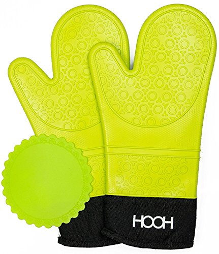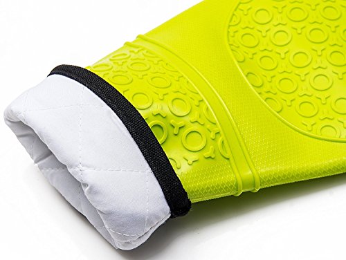 Commercial Grade Heavy Duty Silicone Quilted Oven Mitts Set -One Pair Extra Long Mitts and One Trivet Heat Resistant (Lime)