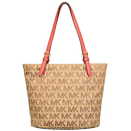 -. Brand : MICHAEL Michael Kors -. Color : Beige/Ebony/Red -. Department : womens -. EAN : 0787421731859 -. Feature : Made of MK Signature Jacquard, Red Leather trim and Gold hardware / Double flat leather straps are adjustable / Magnetic snap closure / Five interior pockets / 11.25"W x 10.25"H x 6"D - Drop = 10" -. ProductGroup : Shoes -. ProductTypeName : HANDBAG -. Title : MICHAEL Michael Kors Jet Set Item Tote in Beige Ebony Red -. UPC : 787421731859