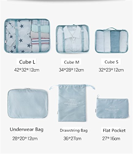 Size Detail of 6 Luggages:1xLarge Cube:16.5"x12.6"x4.7"(42x32x12CM); 1xMedium Cube:13.4"x11"x4.7"(34x28x12CM); 1xSmall Cube:12.6"x9"x4.7"(32x23x12CM); 1xLarge Bag:11"x7.9"x4.7"(28x20x12CM); 1xMedium Bag:14"x10.6"(36x27CM); 1xSmall Bag:10.6"x6.3"(27x16CM)