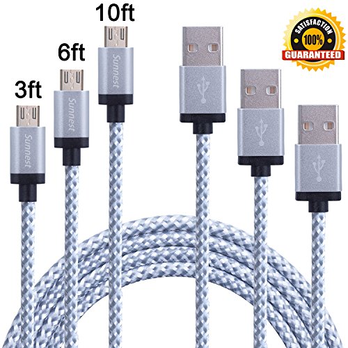 Sunnest 3 Pack 10FT Extra Long Nylon Braided Micro USB Cable High Speed USB 2.0 A Male to Micro B Sync and Charging Cord Wire Universal for Samsung, HTC, Motorola, Nokia, Android, and More(White)
