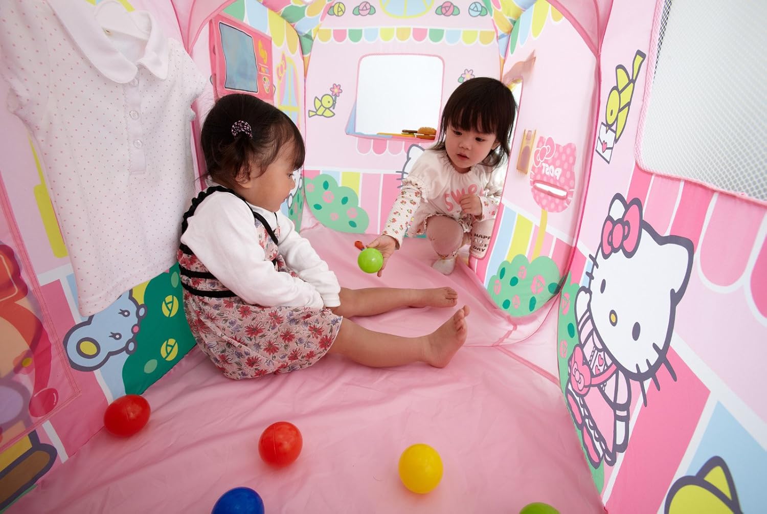 2つのお部屋で遊べる、キティちゃんのハウス遊具です。チャイムやポスト、キッチンまわりのしかけなど、お子様の想像力を高める「ごっこ遊び」のための工夫が随所に盛り込まれています。又、折りたたんで付属の収納袋に入れることができるので片付けの際や持ち運ぶ場合にも便利です。カラーボール10個付き。単四電池3本別売り。