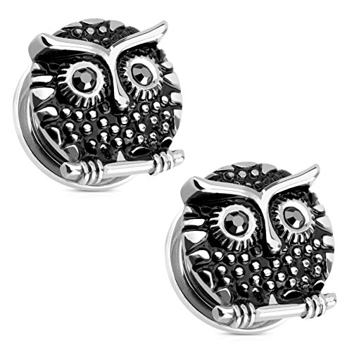 -. Title : Pair of Owl Silver Tone Gemmed Black Eyes Screw Fit Ear Plugs