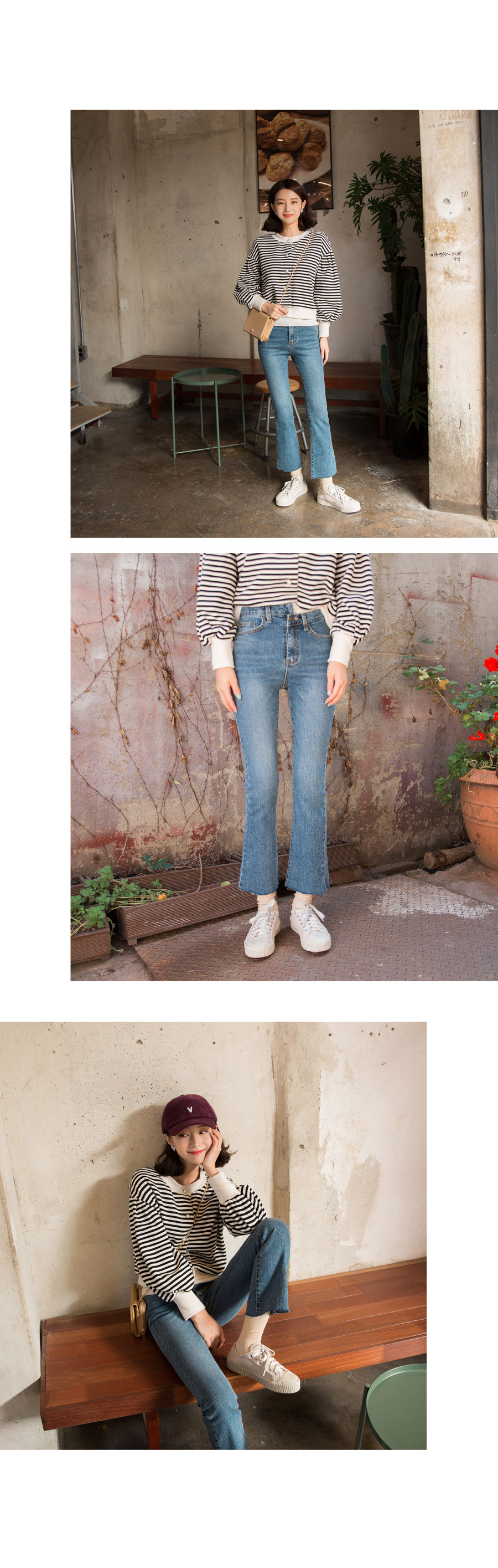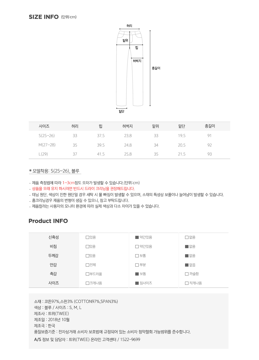 매력적인 슬림핏 탐나는 세미 부츠컷 진 은은한 캣워싱으로 스타일리쉬한 무드가 잘빠진 팬츠로 살짝 다크한 블루톤으로 워싱되어 누구나 부담없이 슬림하게 즐기기 좋은 컬러감의 진이에요~ 팬츠 하나로 다이어트 효과같은 슬림한 느낌과 내츄럴 밑단 컷팅으로 멋스럽게 연출이 가능해요! 겨울을 제외한 모든계절에 착용할수 있는 적당한 두께감으로 실용적이며 스판소재가 함유되어 활동량이 많은 날에도 불편함 없어 자유로운 움직임:) 청바지 핏이 종아리 알도 자연스럽게 숨겨줄 뿐만 아니라 다리가 곧고 길어보이는 효과까지 세상 예쁜 팬츠 추천드려요~^^