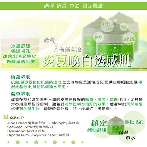 -. Feature : Aloe recitalizes dry skin / Seedweed controls oily skin / Leaving your skin visibly healthy / Annie's Way signature spatula included / Suitable for oily and acne prone skin. Can also be used after sun exposure