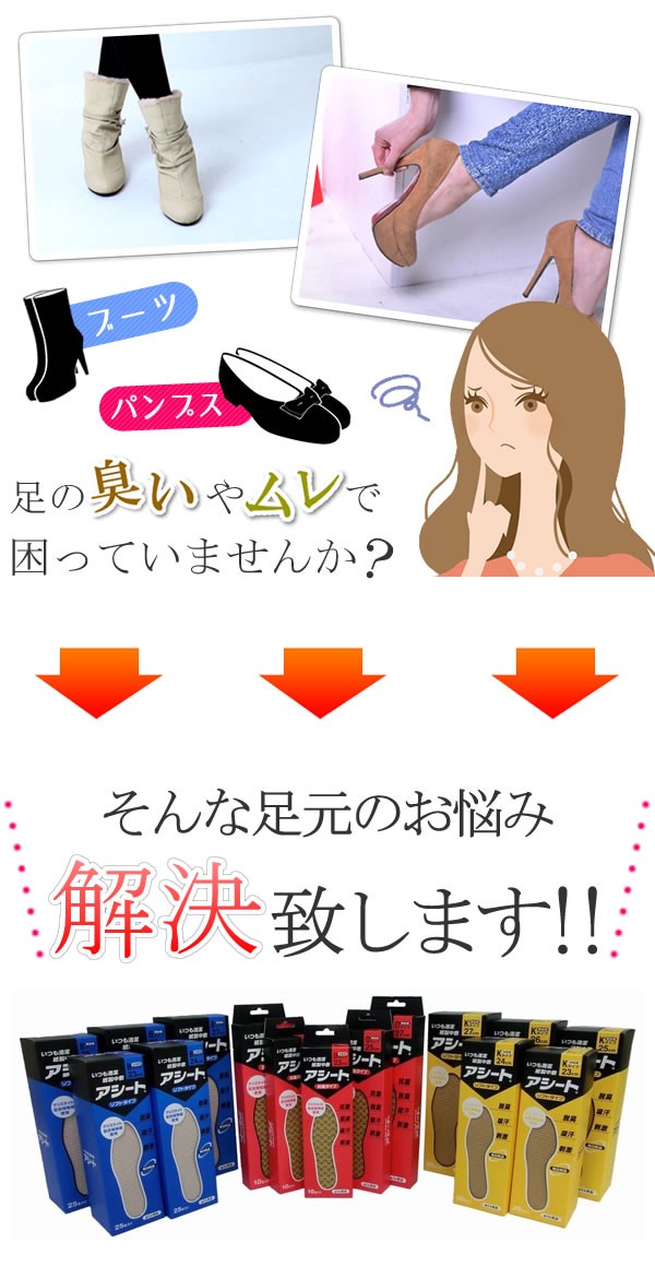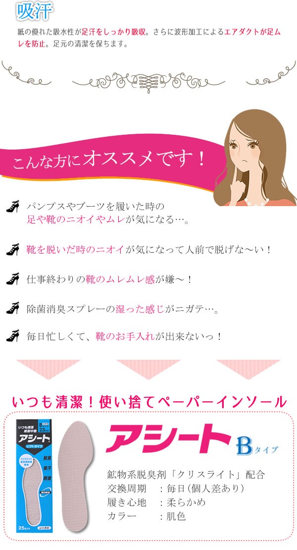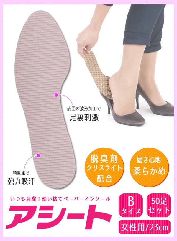 | ------ ココがポイント! ------ | | ●★脱臭★脱臭剤「クリスライト」配合で臭いをしっかり吸収 | | ●★吸汗★紙の力で汗を吸い取りムレを防止 | | ●★刺激★波形加工が足裏を刺激 | | ●★使い捨て★毎日取り替えていつも清潔 | |