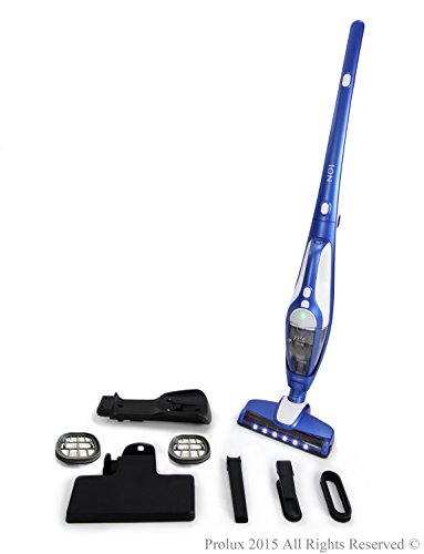 The New Prolux Ion Bagless Battery Powered Stick Vac is the lightweight battery powered alternative for your cleaning needs! This highly compact, powerful, and easy to store vacuum frees you from the limitations of the standard corded vacuums. A bagless design also adds to the ease of cleaning your home. The multi surface Floor Nozzle (with electric brushroll which can be powered off) used in the upright setting to vacuum your hardwood floors, tile and carpet. Also the detachable handheld version is perfect for cleaning your vehicle and other hard to reach areas that other vacuums are just not capable of. This high end vacuum is designed with you in mind and has been built to last for many years to come without breaking the bank or your back! Lightweight - The Prolux Ion Stick Vac does not sacrifice mobility for power. Weighing a almost 6 pounds, this vacuum gives you the versatility that your other vacuums lack. Combined with the lightweight of this vacuum is a powerful DC 80 watt high air flow motor which will take care of your deep cleaning needs. Battery Powered - No more fumbling with those pesky cords! The powerful and long lasting 24V NI-MH 1500mah battery provides the Ion with up to 24 minutes cleaning power (even longer if just using the handheld unit) allowing you to move unrestrained through your home or vehicle. Variety - The Dual Mode allows you to use it for all your floor cleaning as well as handheld cleaning. Included the the Prolux Ion is the 3 in 1 accessory tool which tackles all of your dusting, upholstery, and crevice cleaning jobs with ease. Between the Multi-surface floor tool and 3 in 1 accessory tool, the Prolux Ion Stick Vac can easily clean almost any surface.Feature