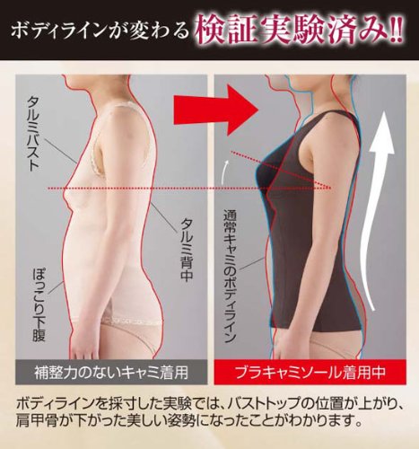 -. Feature : アパレル業界30年!日本女性の体を知り尽くしたプロである土井千鶴先生がこだわり抜いて開発! / 3大タルミ対策ボディサポートブラキャミ!■垂れ乳■ワキ肉■背中肉■スッキリ美胸体型に! / 加齢とともに下垂しがちなバストを立体的に支え、美胸をメイク&キープします。 / みっともないワキ肉のタルミ・・・無駄な流れ肉をすっきりと押さえ込むサイドパワーライン補整。 / ブラ線が食い込む背中のタルミ肉を広範囲でカバーし、日本女性に多い猫背を背中のクロスサポートベルトがシャッキリさせます。