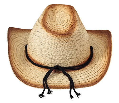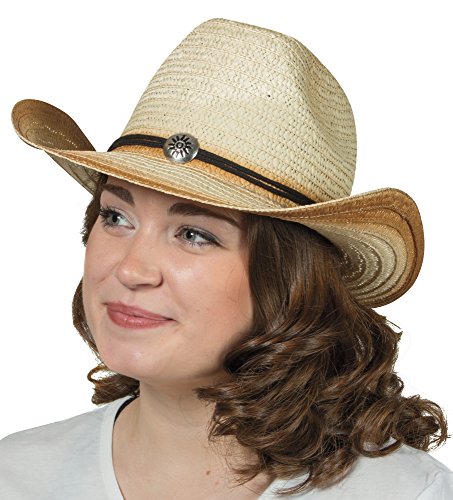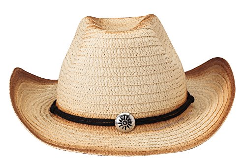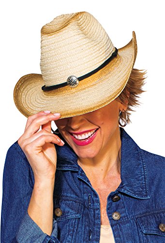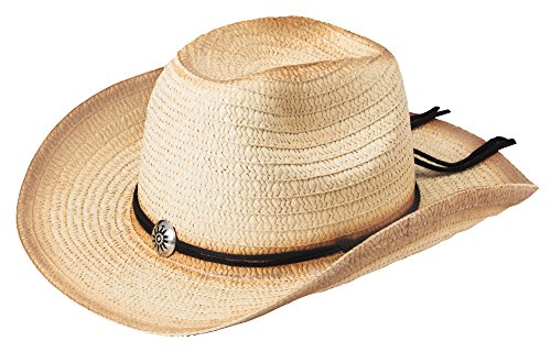 Product Description Tip your hat in style! Woven straw cowboy hat, accented with black cording and a front plastic silver medallion for a western feel. Wire edges to get that perfect shape. One size fits most. 14¼" x 13". 0