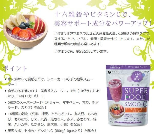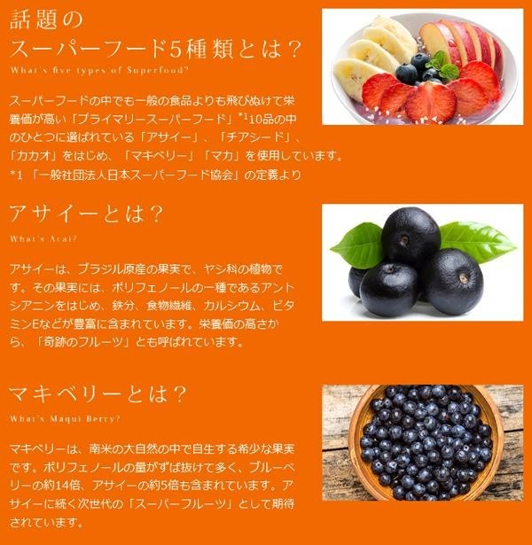 【スーパーフードとは】 一般の食品よりビタミン、ミネラル、アミノ酸といった必須栄養素や健康成分を多く含む食品のことです。 本品は5種類のスーパーフード(アサイー、ファインマキベリー(R)、マカ、チアシード、カカオ)、16種類の穀物、さらにビタミンCをプラスしたアサイーボウル仕立てのスムージーです。