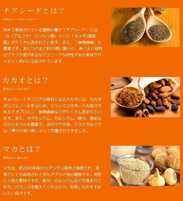 | ●5種類のスーパーフードと16種類の穀物+ビタミンが入った栄養満点のスムージー。朝食代わりにも。 | | ●水や牛乳、豆乳などに溶かして飲むだけ!!さっと溶けるのでシェーカーいらずでお手軽♪ | | ●アサイーベースのフルーティーな味わいとチアシードのつぶつぶ食感で満足感◎ |