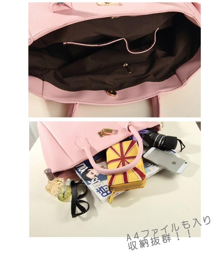 | スタッフより | お仕事にもカジュアルにも使えるシンプルベーシックな合わせやすい高級トートバッグの登場です☆ 嬉しいA4サイズ対応、内ポケットもしっかりついていて実用性の高さはピカイチです^^ 高級PU使用でお仕事にもお出かけにも、毎年使えるデザインが嬉しい♪ 手もち、肩掛け、斜め掛け、そのときの気分や用途によって使い分けられるのも嬉しい。 |