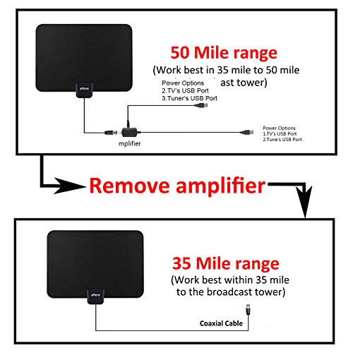 10FT Long Coaxial Cable - The extra 10ft coaxial cable makes it easy for you to place the HD antenna in the best reception spot in your home, especially for customer whose televisions are quite far away from windows. Ahere digital tv antenna can be powered either by an outlet or a TV's USB port and very easy to install.