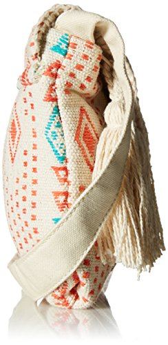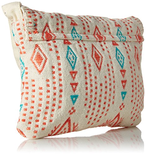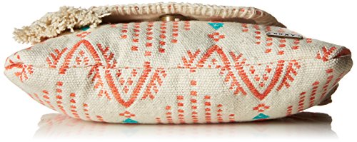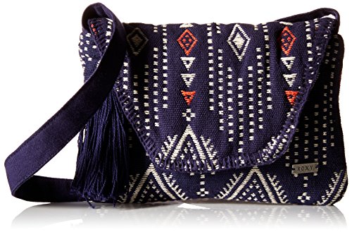 Custom, novelty fabric small cross body bag, main closure with nylon zipper under the flap, and Roxy metal plate.