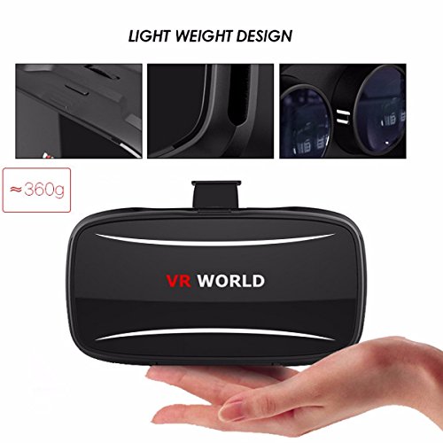 -. Feature : New & Improved Ergonomic Design Provides an Extremely Comfortable & Enjoyable Experience For The User. Comfort design with sponge area - Adjustable straps for ideal weight distribution. Extremely soft and thick foam is perfect long time use. / Fit everyone's eyes: Adjustable focal and pupil settings for the best 3D experience, even to those near-sighted.Turn your smartphone into a virtual reality viewer. Enjoy real 360° videos and immersive world of VR from the comfort of your home. / Whenever you want to enter virtual reality, just take your smartphone, slide it in the VR WORLD, and you're in. It's that simple.It's easy to transport yourself with the VR WORLD. Whether you want to play a game, take a virtual vacation, or watch a movie, the possibilities with VR WORLD are limitless. / The home theater of your dreams-Watching a movie in a VR theater is the next best thing to owning your own personal multiplex. Free from the distractions of the outside world, you'll be completely immersed as you watch your favorite movies on a theater-sized scale. / Wide compatibility: Suitable for 3.5-6.0 inch smartphones, your new portable gaming system-Step inside the game with VR WORLD and be a part of the action like you're really there. You can use your head movement to explore, aim, and interact - it's an entirely new way to play.